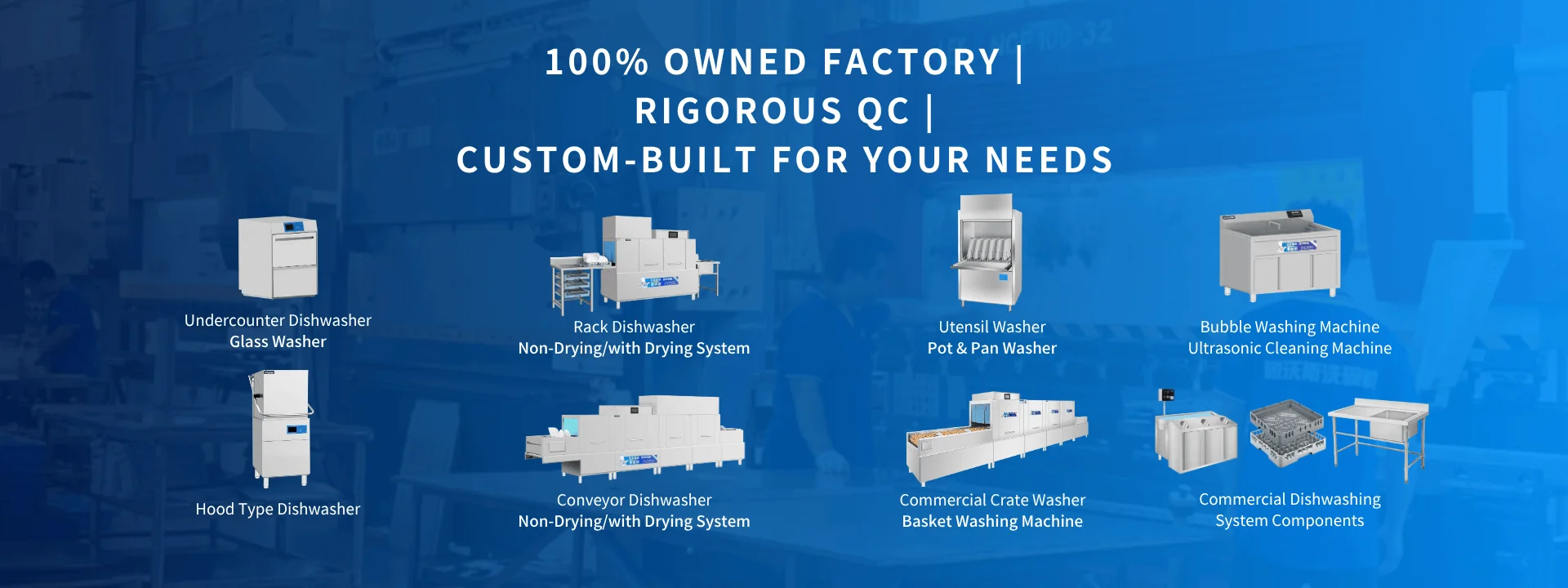 We are a professional manufacturer specialized in commercial dishwasher equipments with many years experiences. Now we have 4 main dishwasher products including under counter glass washer, hood type dishwasher, rack conveyor dishwasher and Long line conveyor dishwasher.